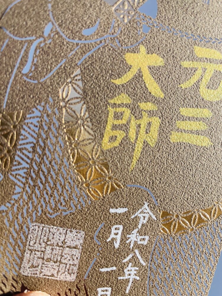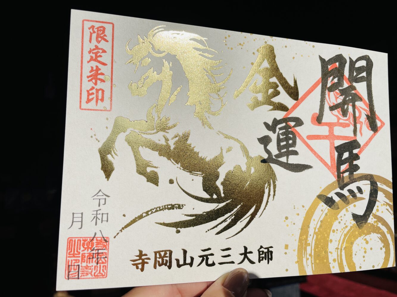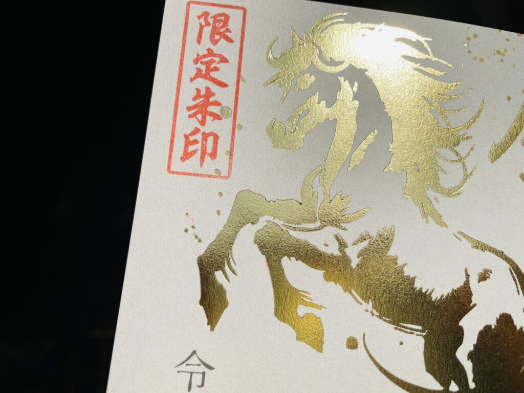 力強い馬の姿と「金」を箔押しにしたゴージャスな限定御朱印です。ぜひ新年の朝日に当ててみなさまの一年が輝かしい「金運開花」ならぬ「金運開馬」となりますように。