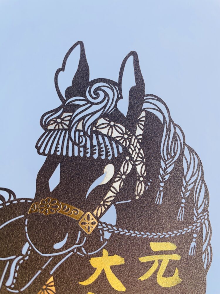 だいきょ屋さまコラボ!馬の切り絵朱印にしました。「頭絡(とうらく)、馬銜(はみ)、手綱(たづな)など繊細なパーツを見事に切り絵に仕上げました。