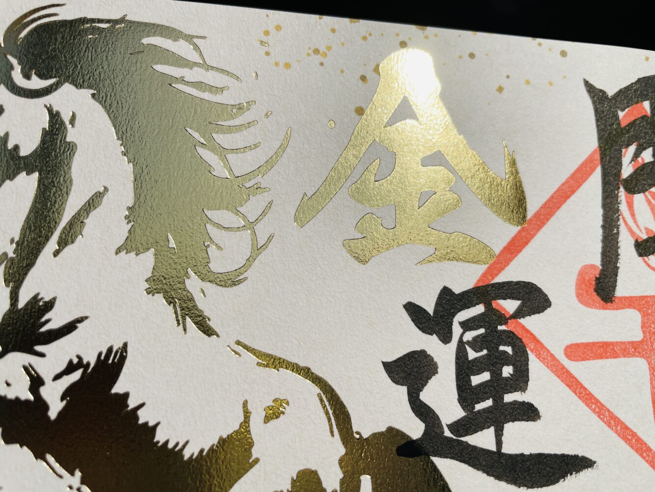 力強い馬の姿と「金」を箔押しにしたゴージャスな限定御朱印です。ぜひ新年の朝日に当ててみなさまの一年が輝かしい「金運開花」ならぬ「金運開馬」となりますように。